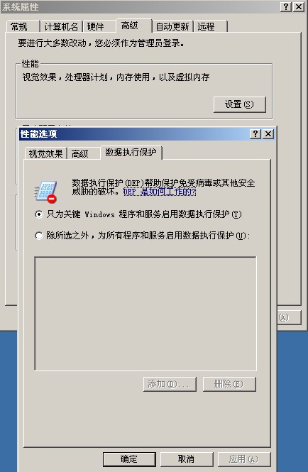 在“我的电脑”->右键“属性”->“高级”->“性能”->“设置”->“数据执行保护”