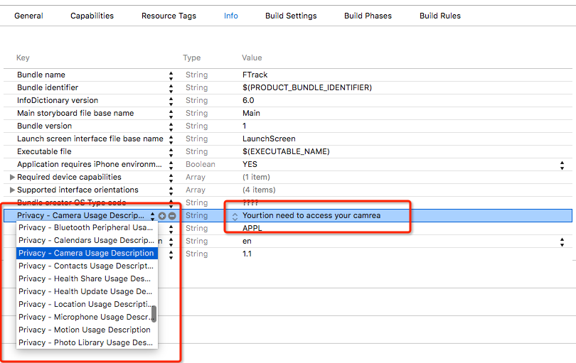 定义获取摄像头权限的描述为 : “Yourtion need to access your camera”