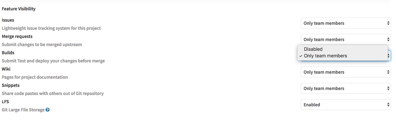 如果你已经有 Share 的 Runner 同时项目默认也开启了 Builds 的功能,那么在项目主页应该可以看到 Pipelines 的选项,没有开启的话,可以在 Edit ProjectFeature Visibility 中设置 BuildsOnly team members (如下图)。