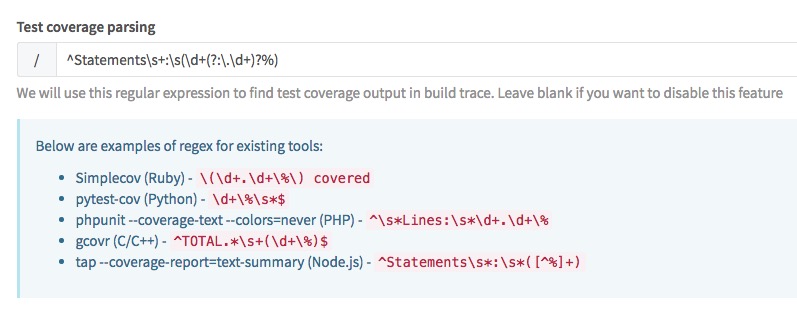 接下来只要修改 CI/CD Pipelines 中的 Test coverage parsing 的内容为 ^Statements\s+:\s(\d+(?:\.\d+)?%) 就可以让 GitLab 自动获取到代码测试覆盖度的情况。如下图: